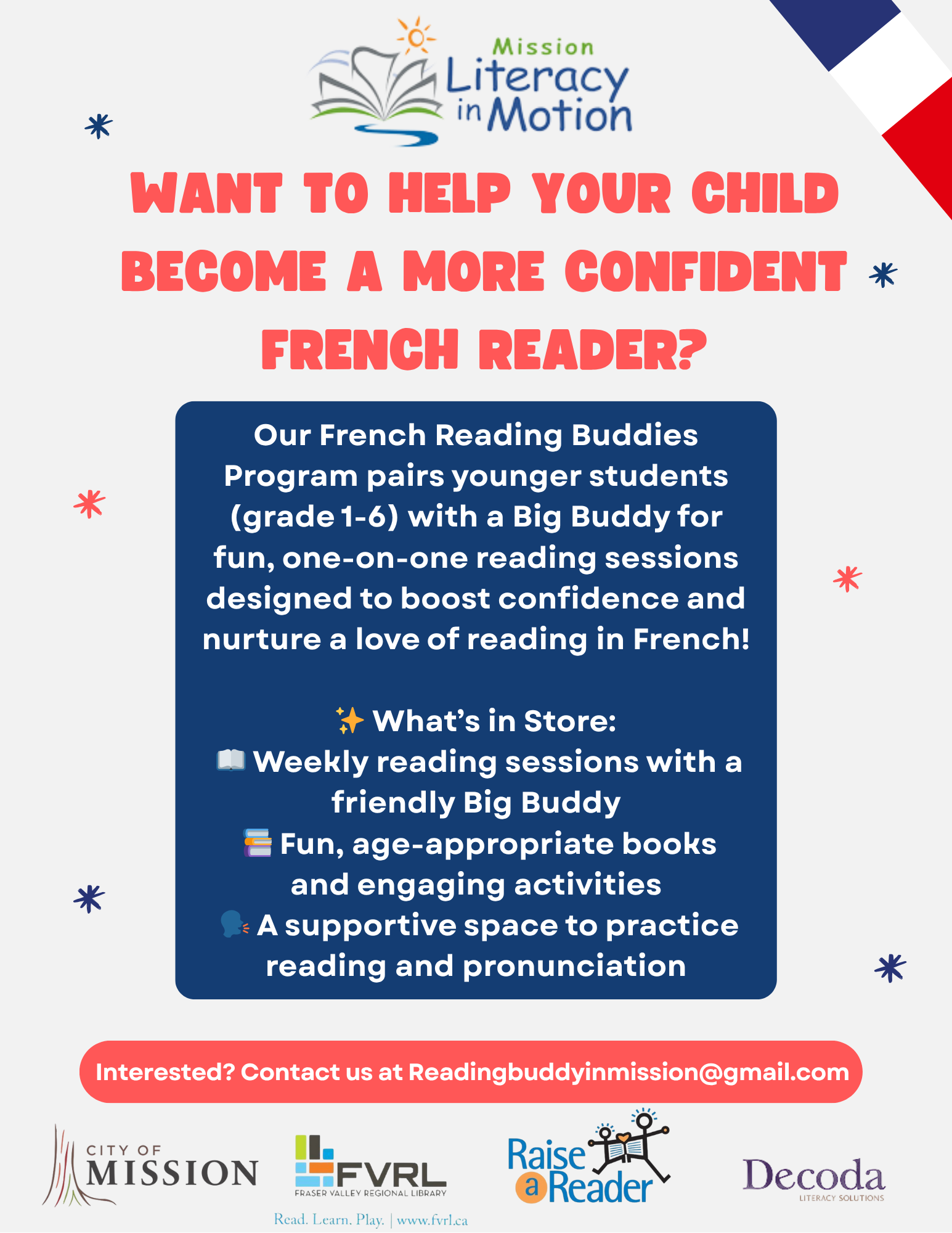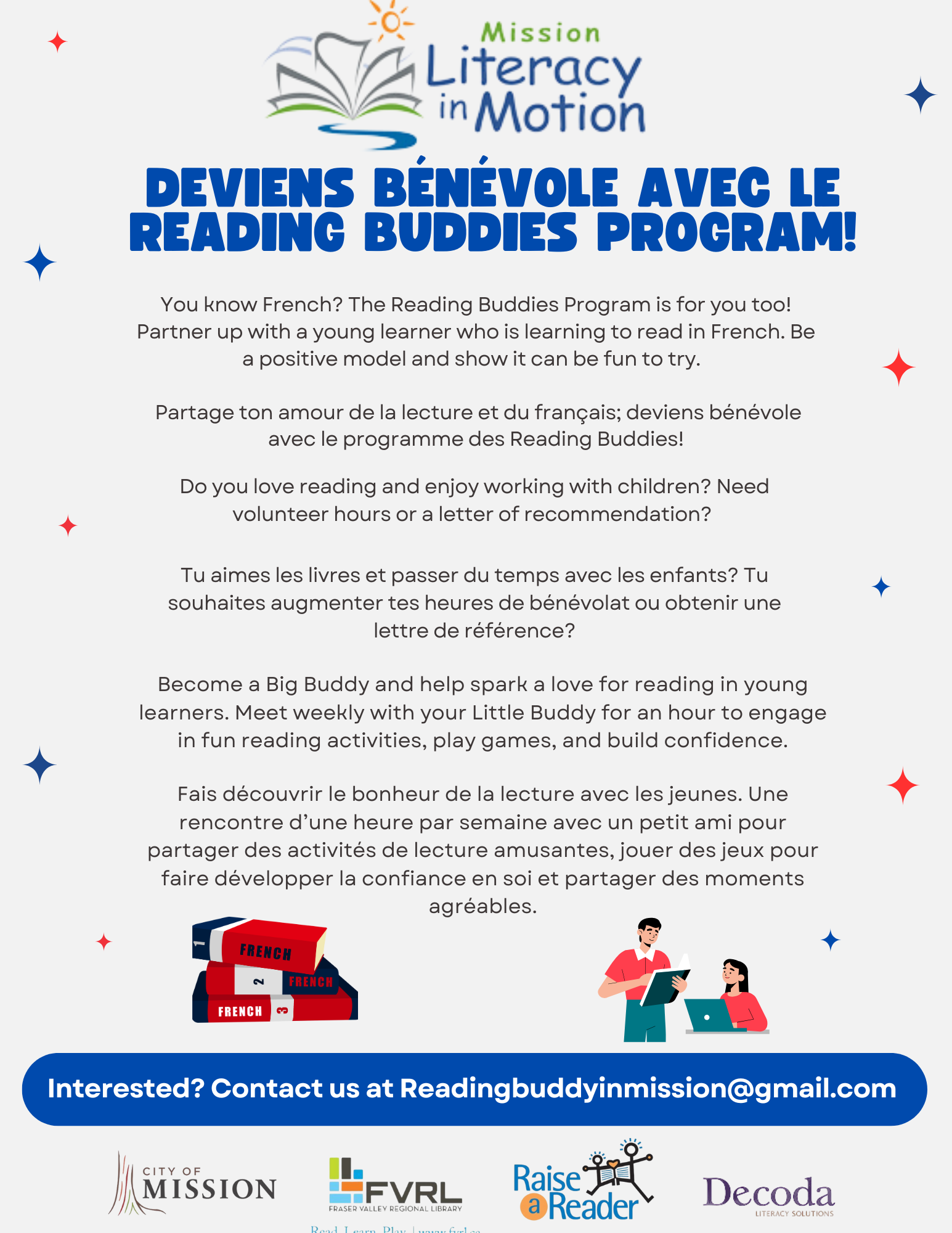 The volunteer (Big Buddy) and the young reader (Little Buddy) meet once a week for one hour, on the same day and time at the Mission Public Library, where they build reading skills and enjoy fun, educational games that make learning engaging and rewarding. Student volunteers can use the hours toward their graduation requirements.